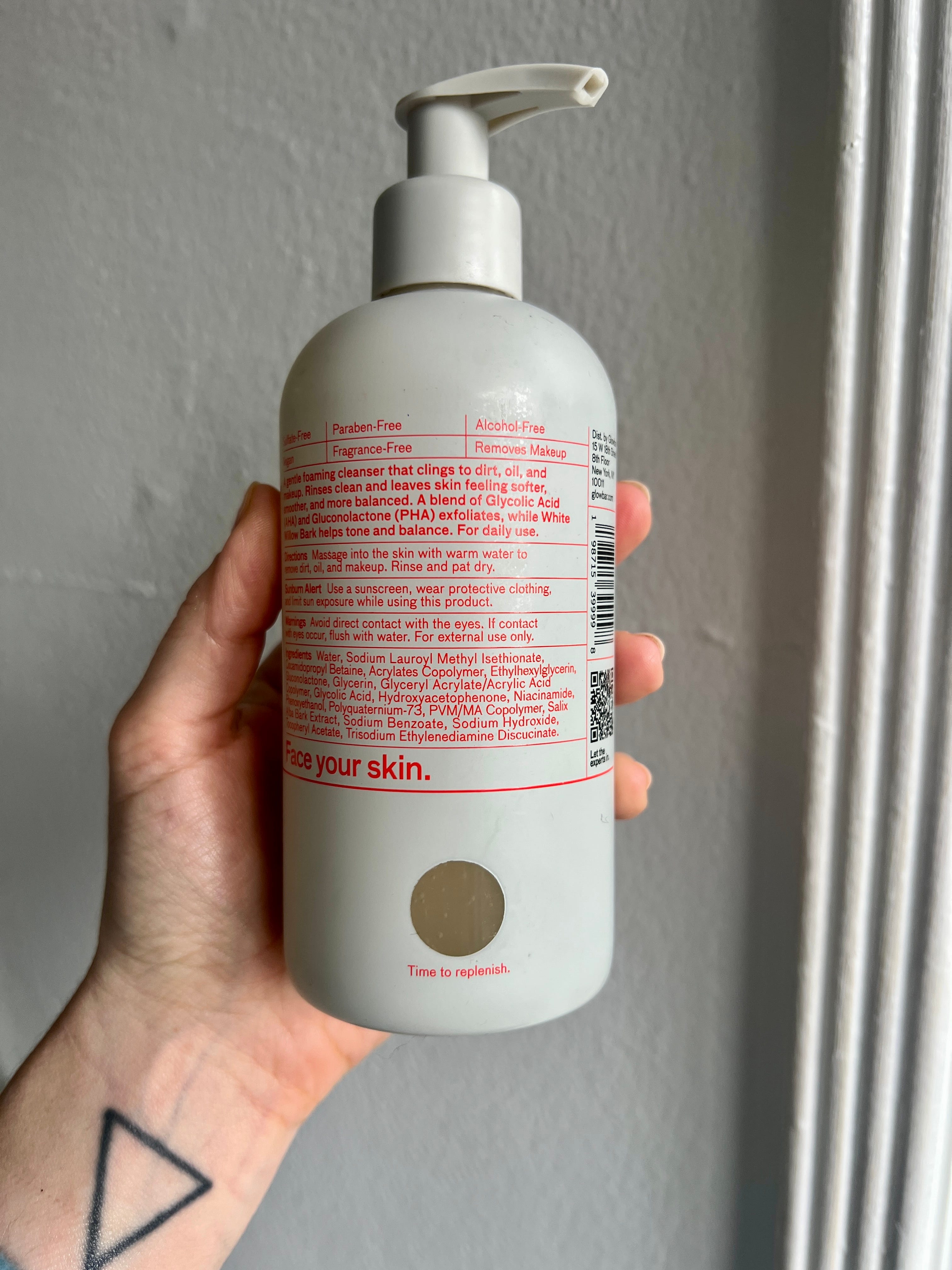Now go in with a gentle foaming cleanser to ensure you’ve actually removed all the gunk—not just moved it around. Before I started double cleansing, I was 100% not getting everything off. I knew it because every time I swiped micellar water on a cotton pad afterward, it still came up beige from my tinted moisturizer.