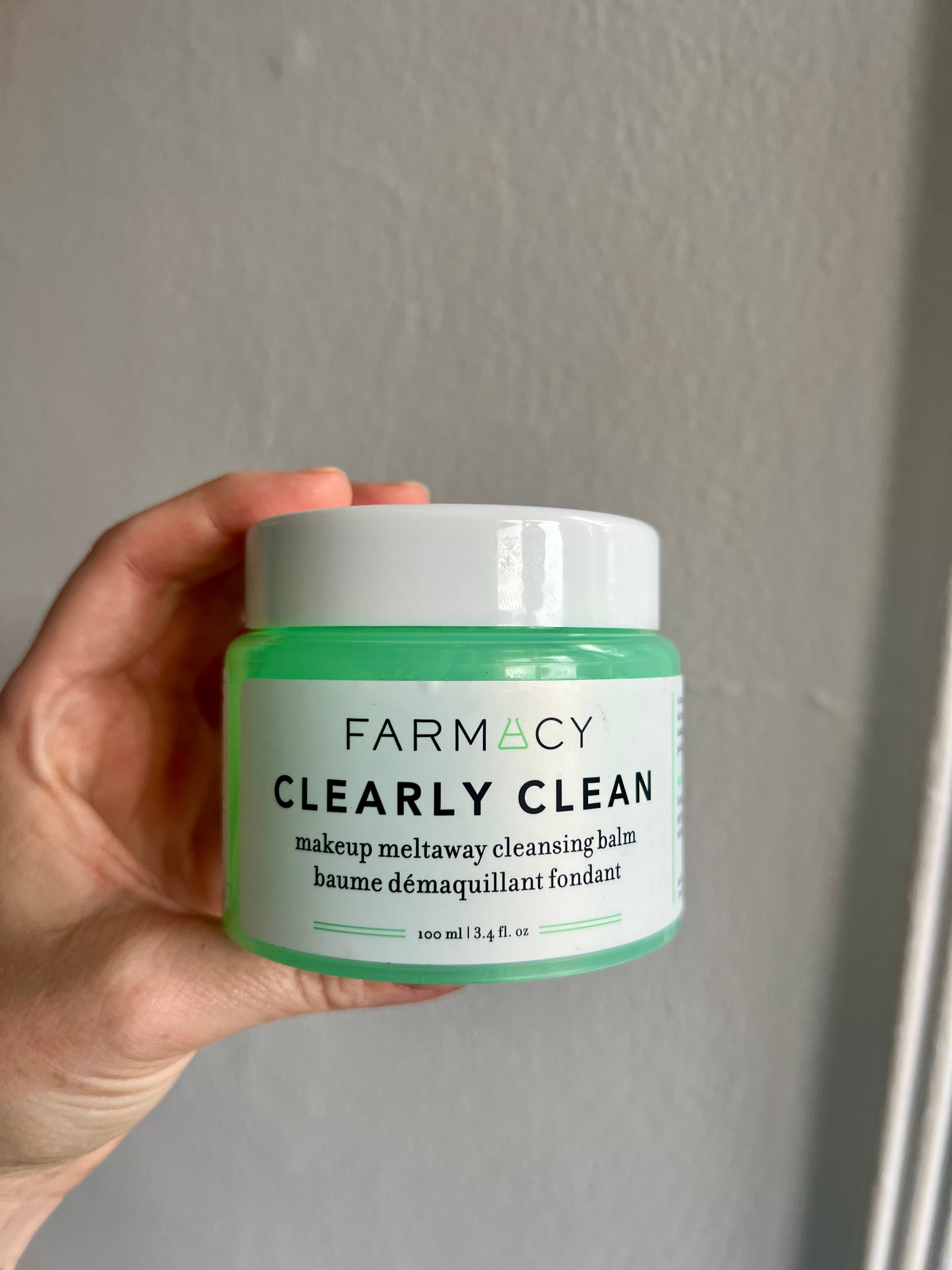 My current go-to is Farmacy Clearly Clean. I’m picky—too many cleansers in this category just sit on top of your skin. This one scoops out cleanly with a tiny spatula (bless), emulsifies beautifully, and melts away every the goop of the day. Bonus: it’s formulated for sensitive skin, so it does the job without freaking your face out.